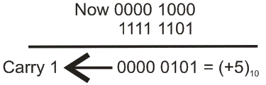 在2的补充中添加,它总是遵循与正常使用的相同规则二进制添加。假设我们要添加(8)10.(-3)10.。