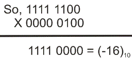 对于2的补充乘法,它始终遵循与相同的规则二进制乘法。假设我们想要乘以( - 4)10.与(4)10.给出(-16)10.。现在,( - 4)10.= 1111 1100在2的补充中和(4)10.= 0000 0100在2的补充中