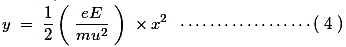 由于这个力,电子将沿y轴偏转,并让沿y轴的偏转等于D,如图所示。由于电子的力F有净向上加速度沿该加速度是由积极的y轴和Ee /处理(d×m)初速度沿y方向积极为零所以通过运动方程我们可以写沿y轴位移的表达式,