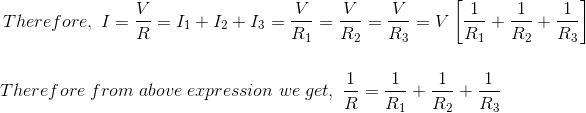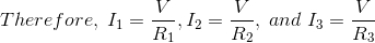 假设有三个电阻R1, R2,和R3.是平行连接的吗电压源V(伏特)的值如图所示。设I(安培)为总电路电流,总电路电流分为电流I1,我2,和我3.流经R1, R2,和R3.分别。现在根据欧姆的法律: