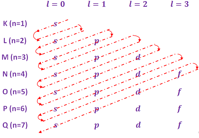 - 每个主壳层(能级)又细分为亚壳层。这些亚能级被称为轨道。这些亚壳层/轨道用s、p、d、f等表示,轨道量子数l = 0,1,2,3,4,.....(n-1)等。任意主壳层的亚壳层数等于“主量子数”n。