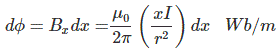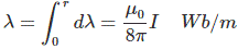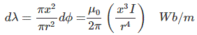 在这里导体的整个截面积并不包含上述表示的通量。半径为x的圆内的横截面积与总横截面积之比导体可以被认为是连接的分数转通量.因此通量链为