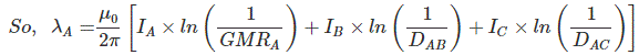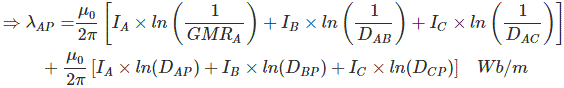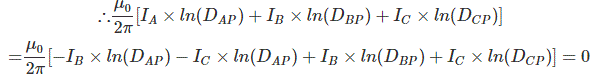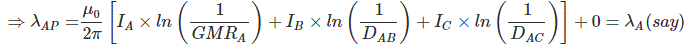 现在,让我们考虑在三个导体附近的点P。因此,通过导体A的电流在点P处的磁链为,