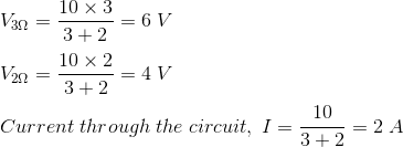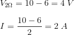 电压横贯2Ω是V2Ω= 10 - 3× 2 = 4 V和电压通过2A电流源是V2= 10 - 4 = 6